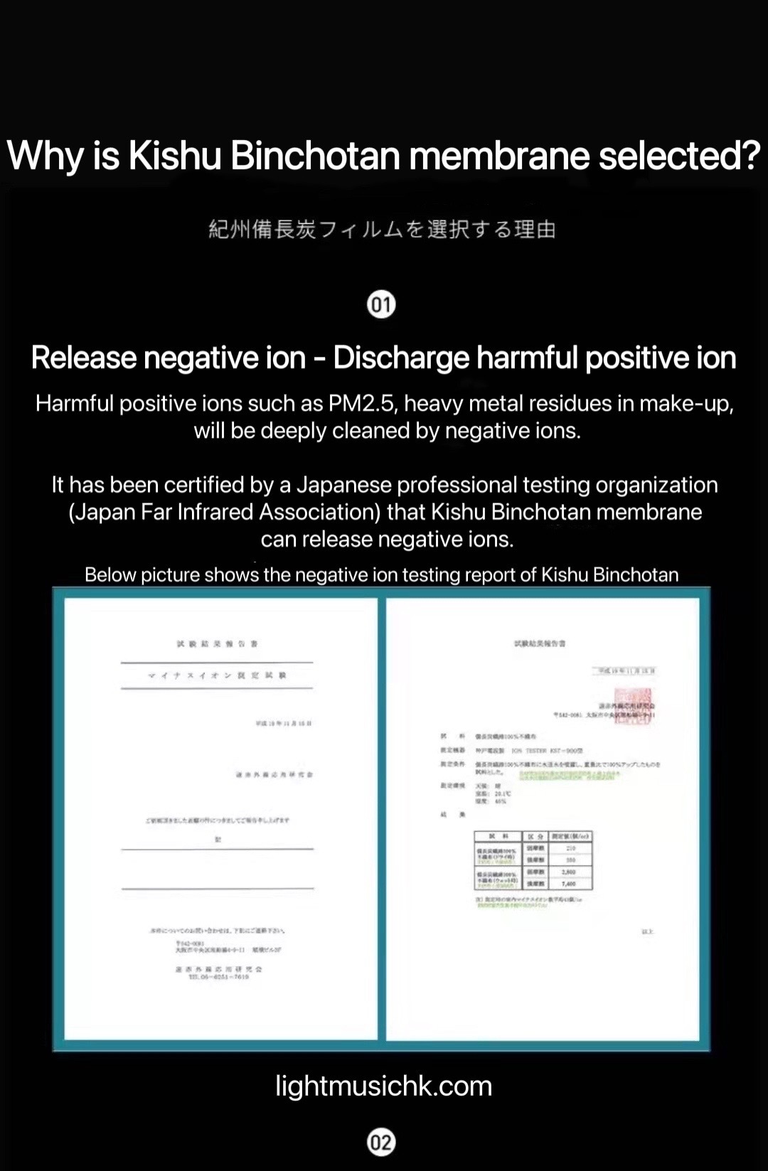 LIGHTMUSIC revolutionary invented this functional mask membrane. With exclusive futuristic technology, the "black gold of Charcoal" binchotan and rare platinum are nanosized. It is mixed and woven in the plant fiber mask membrane.
