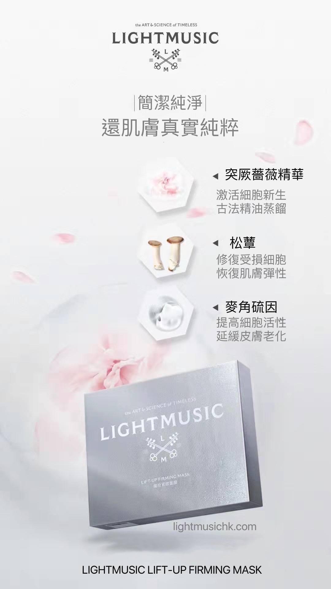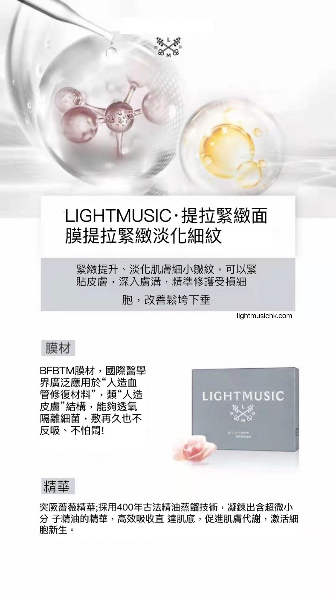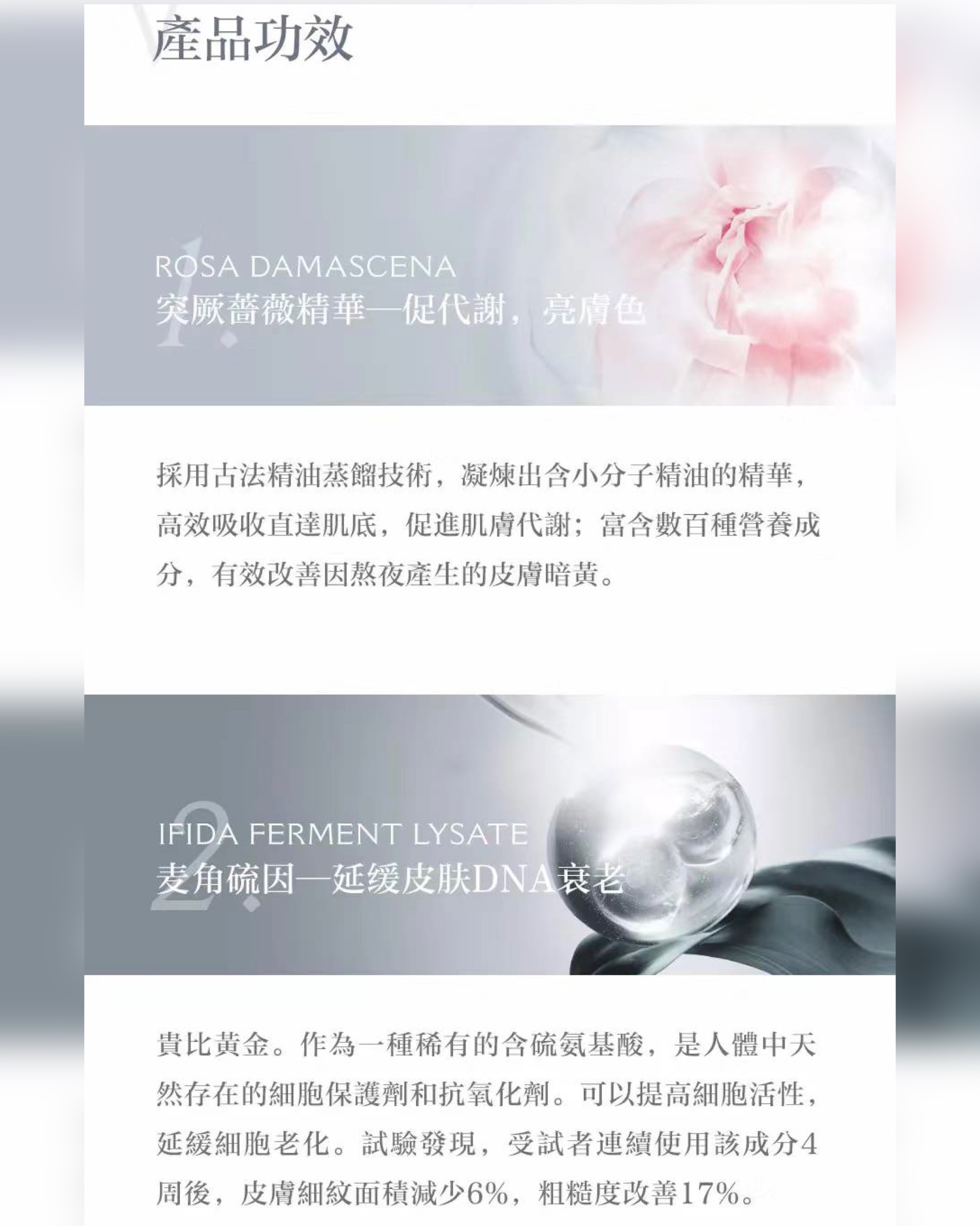 甄選大馬士革突厥薔薇花純露與麥角硫因精華,配合微生物發酵纖維提拉膜布。