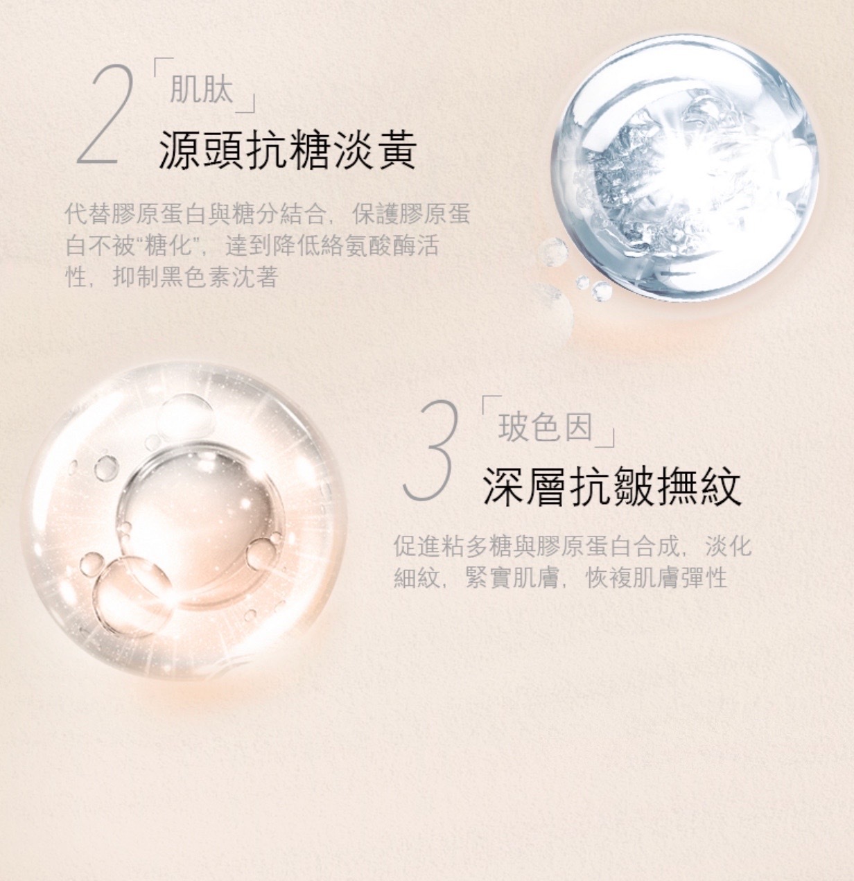 明星抗糖化成分,有著「液體超聲刀」的美譽,肌肽能快速包裹肌膚內多餘的糖分,代替膠原蛋白與糖分結合,幫助降低皮膚蛋白質糖化傷害,淡黄煥亮。