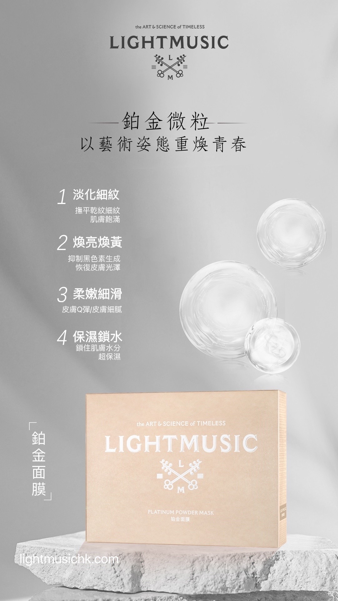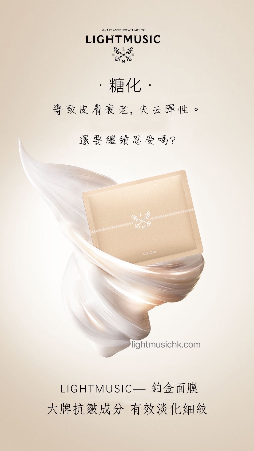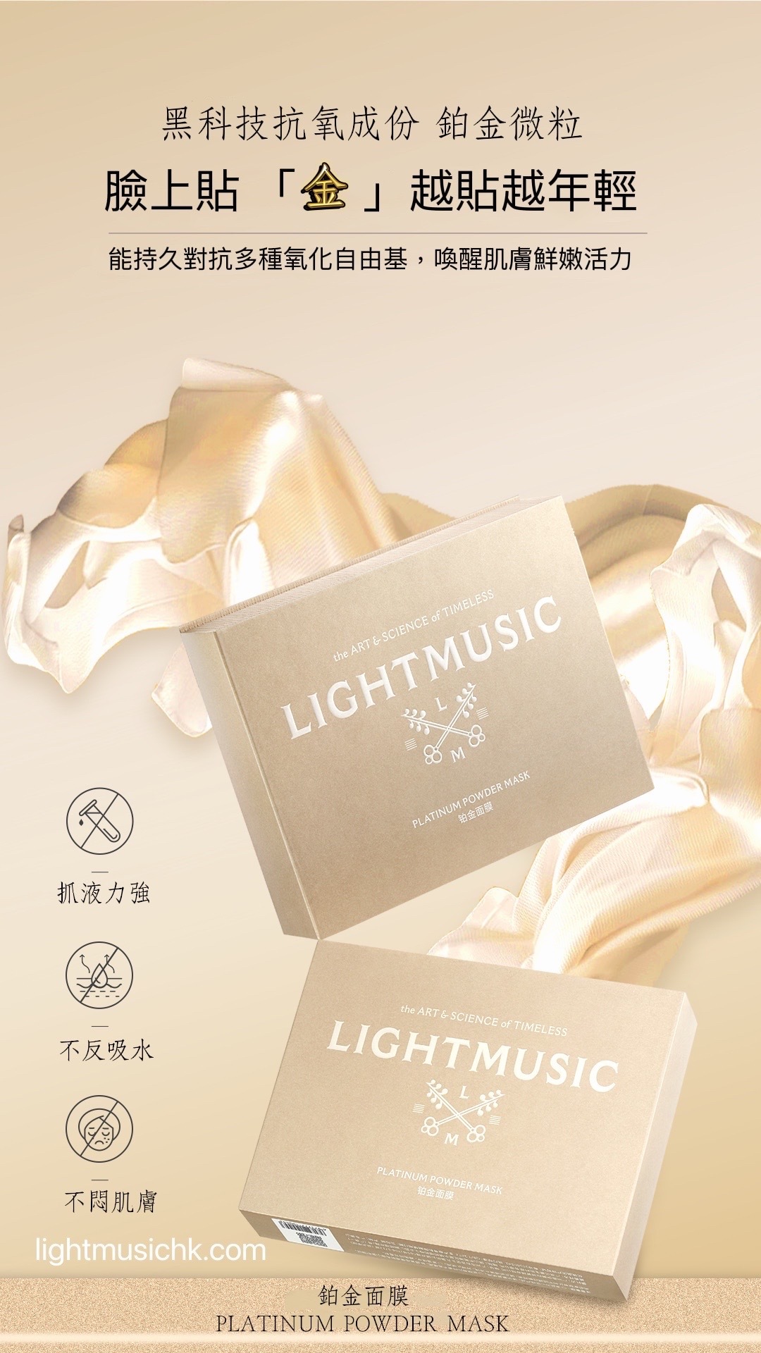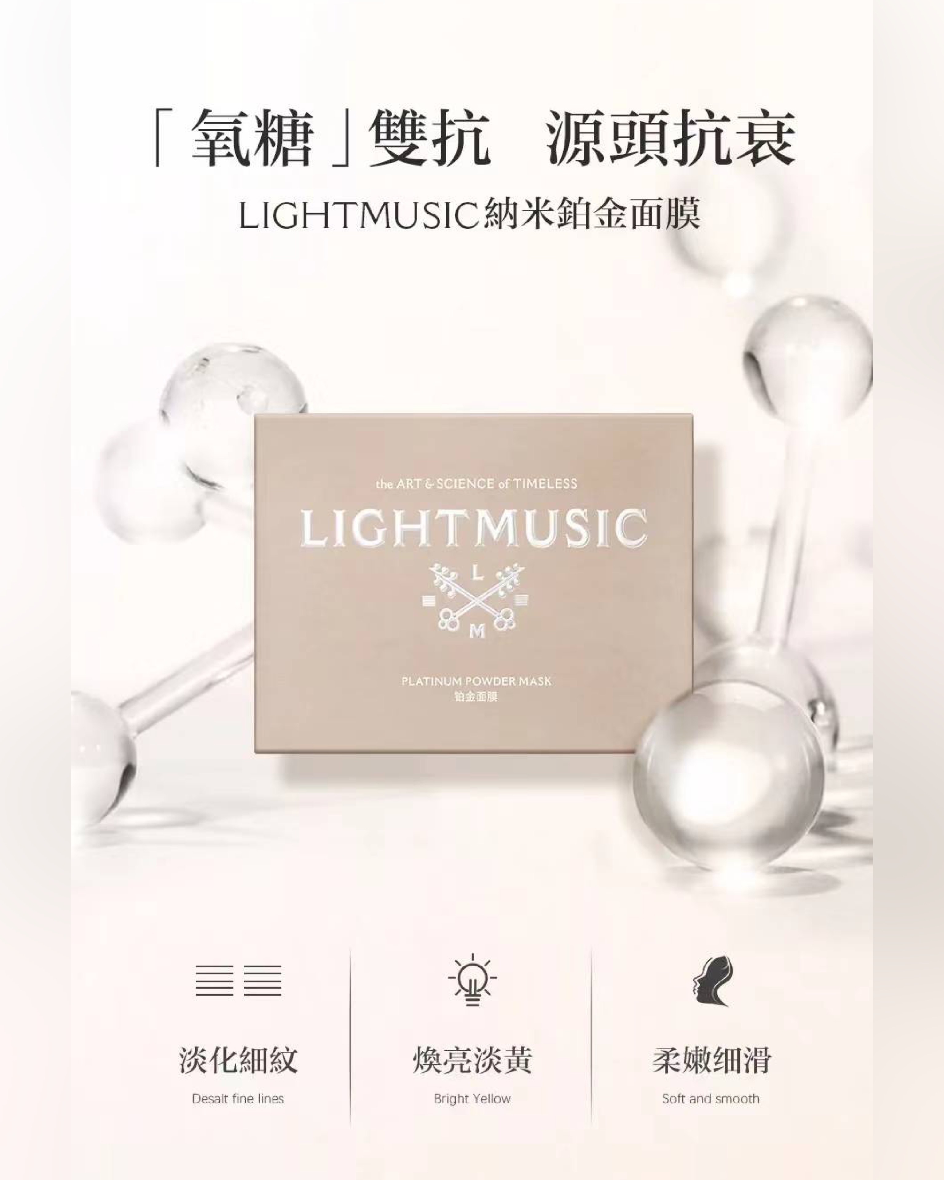 LIGHTMUSIC鉑金面膜,專研 「氧糖雙抗」配方。有效抗氧化、抗糖化、抗衰老。