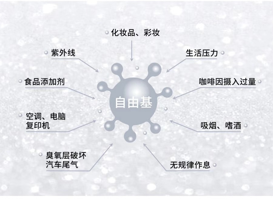 人体与外界持续接触,体内就会产生自由基。自由基无处不在,具有强氧化性且极其不稳定。