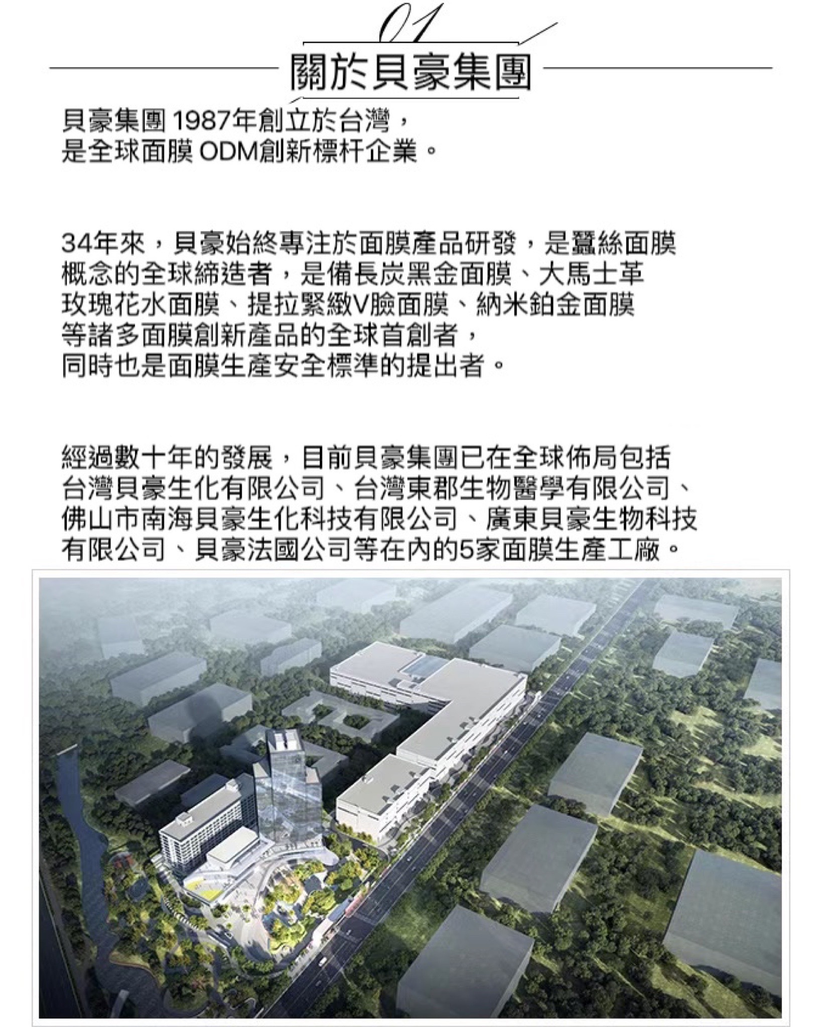 贝豪集团始于1987年,为全球各大牌提供面膜制造。现自主品牌 LIGHTMUSIC拥有自有工厂,全球化面膜研发平台及多领域研发团队,专注面贴膜品类创新升级。