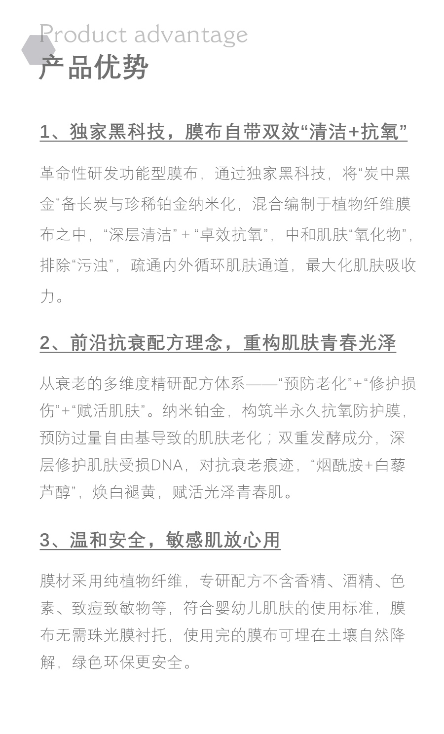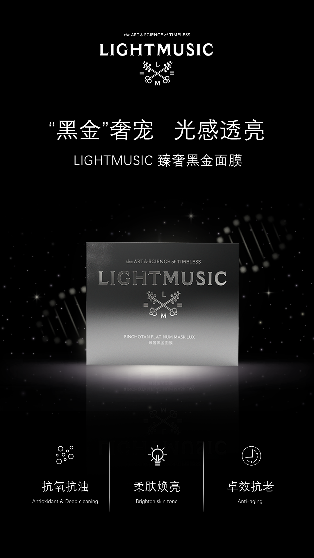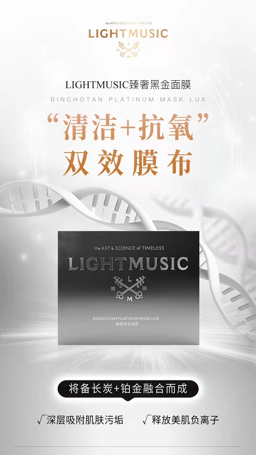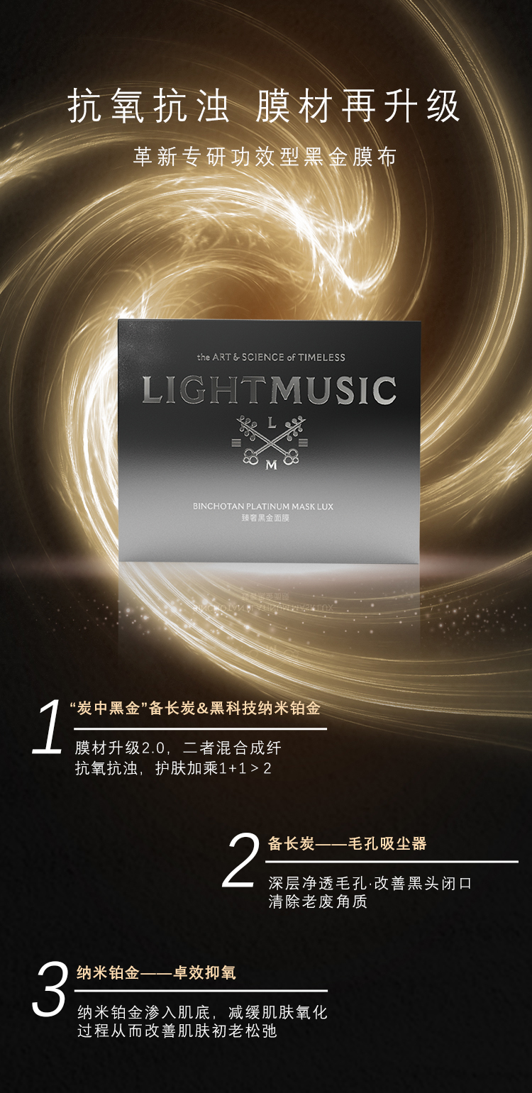 LIGHTMUSIC革命性研发功能型膜布。通过独家黑科技,将“炭中黑金”备长炭与珍稀铂金纳米化。混合编制于植物纤维膜布之中。深层清洁+自带抗氧,中和肌肤「氧化物」,排除「污浊」,疏通内外肌肤通道,最大化肌肤吸收力。