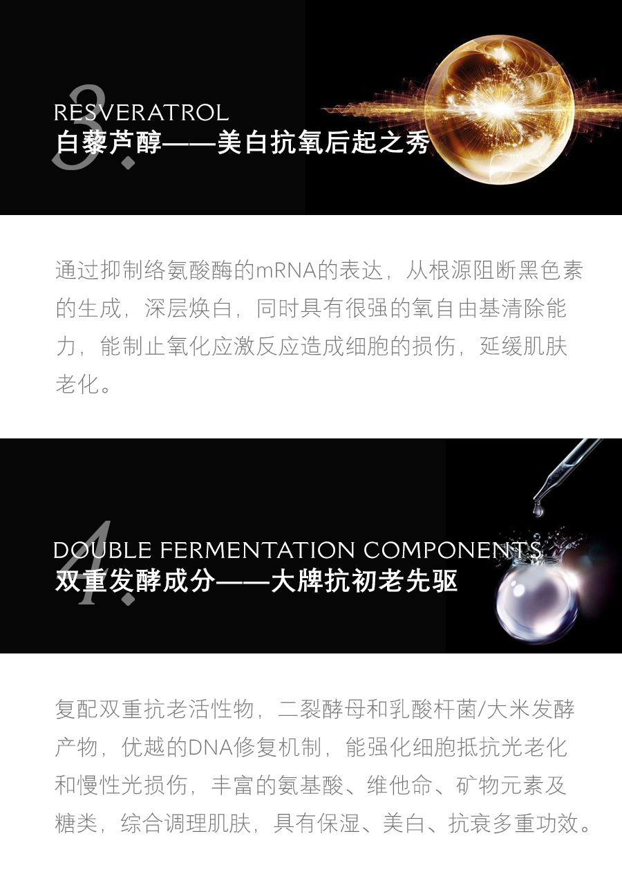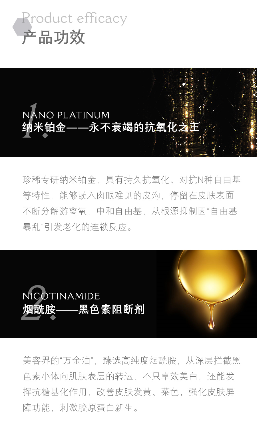 纳米铂金,构筑半永久抗氧防护膜,预防过量自由基导致的肌肤老化;双重发酵成分,
