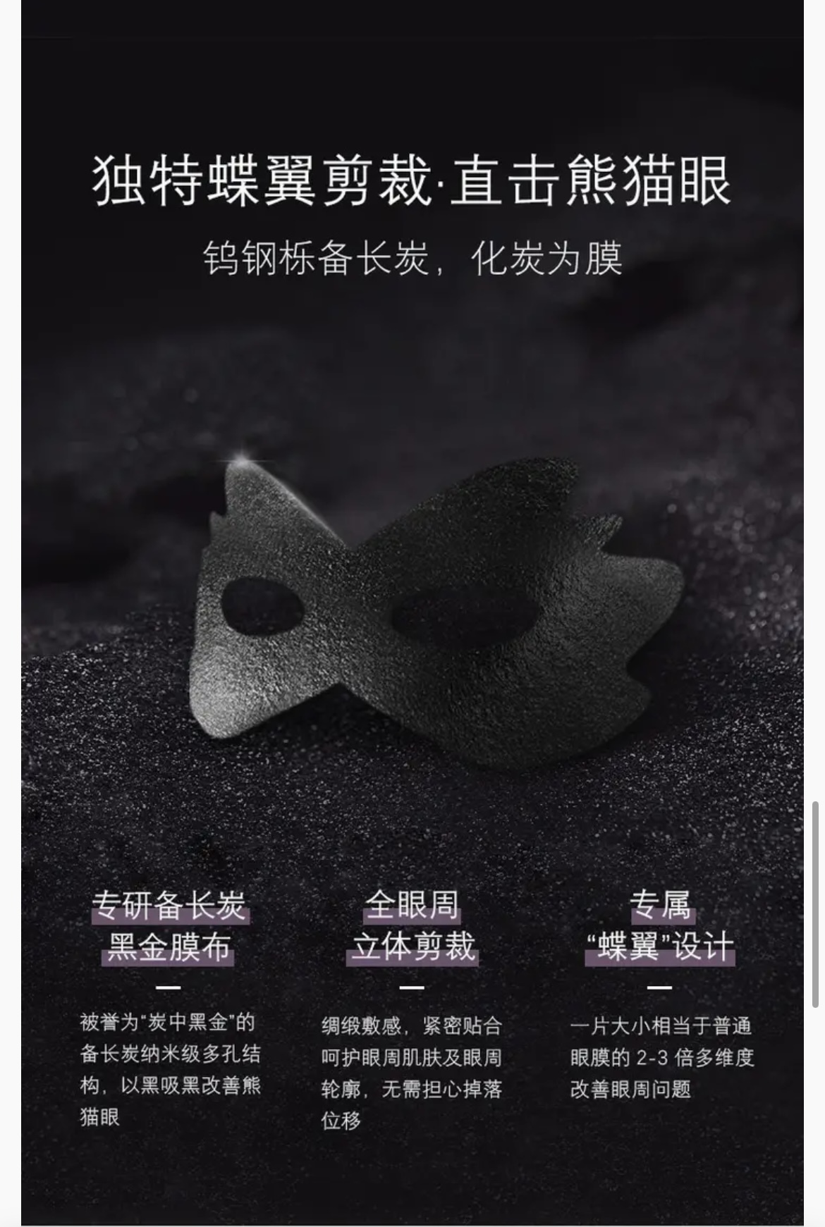 专研备长炭黑金膜布,被誉为“炭中黑金“的备长炭,纳米级多孔结构,以黑吸黑。一片改善熊猫眼。