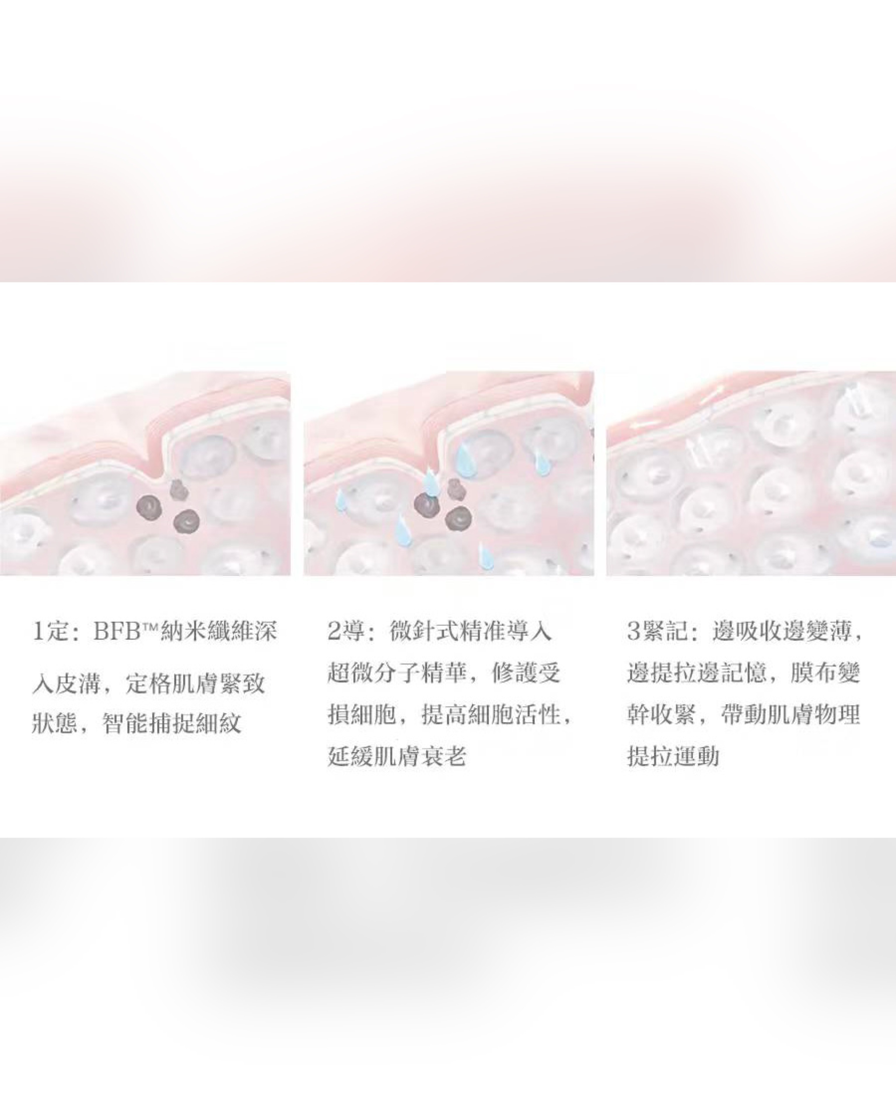 1定:BFB™纳米纤维深入皮沟,定格肌肤紧致状态,智能捕捉细纹。