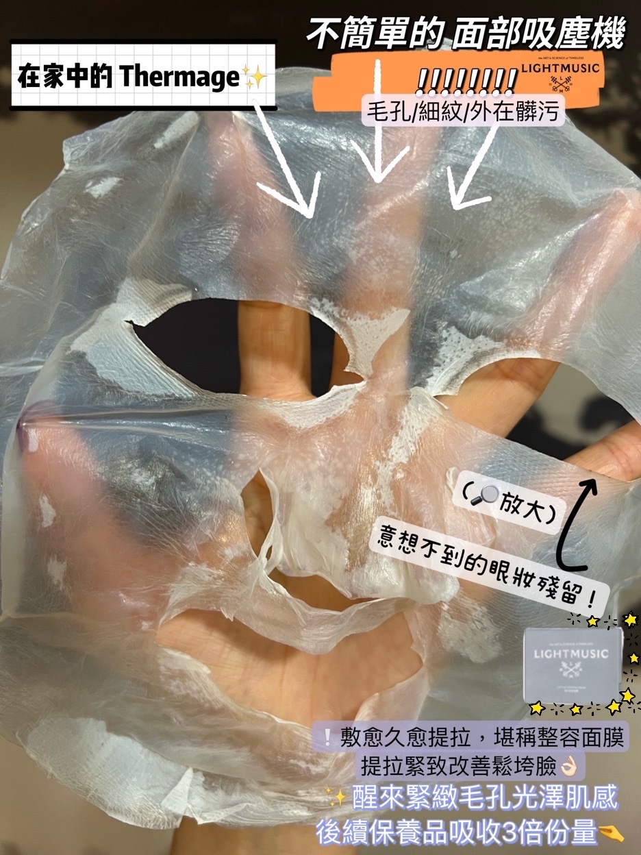 •LIGHTMUSIC 创新的部分在于可以不添加任何的防腐剂、增稠剂,把精华液都灌进了膜布的纤维中空管道里面去。