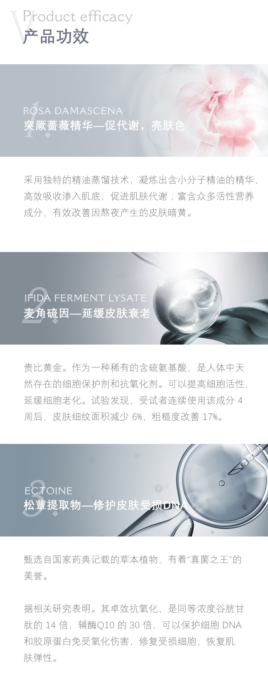 甄选大马士革突厥蔷薇花纯露与麦角硫因精华,配合微生物发酵纤维提拉膜布。