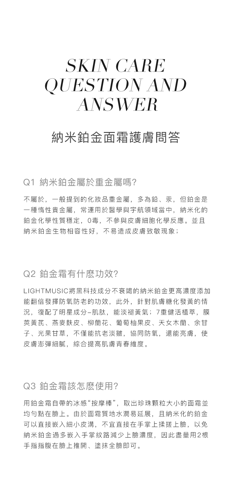 由于面霜质地水润易延展,且纳米化的铂金精华,可以直按嵌入细小皮沟,不宜直接在手掌上揉搓上脸,以免纳米铂金过多嵌人手掌纹路降低上脸有效浓度。因此尽量用1根手指指腹在脸上推开、涂抹全脸即可。