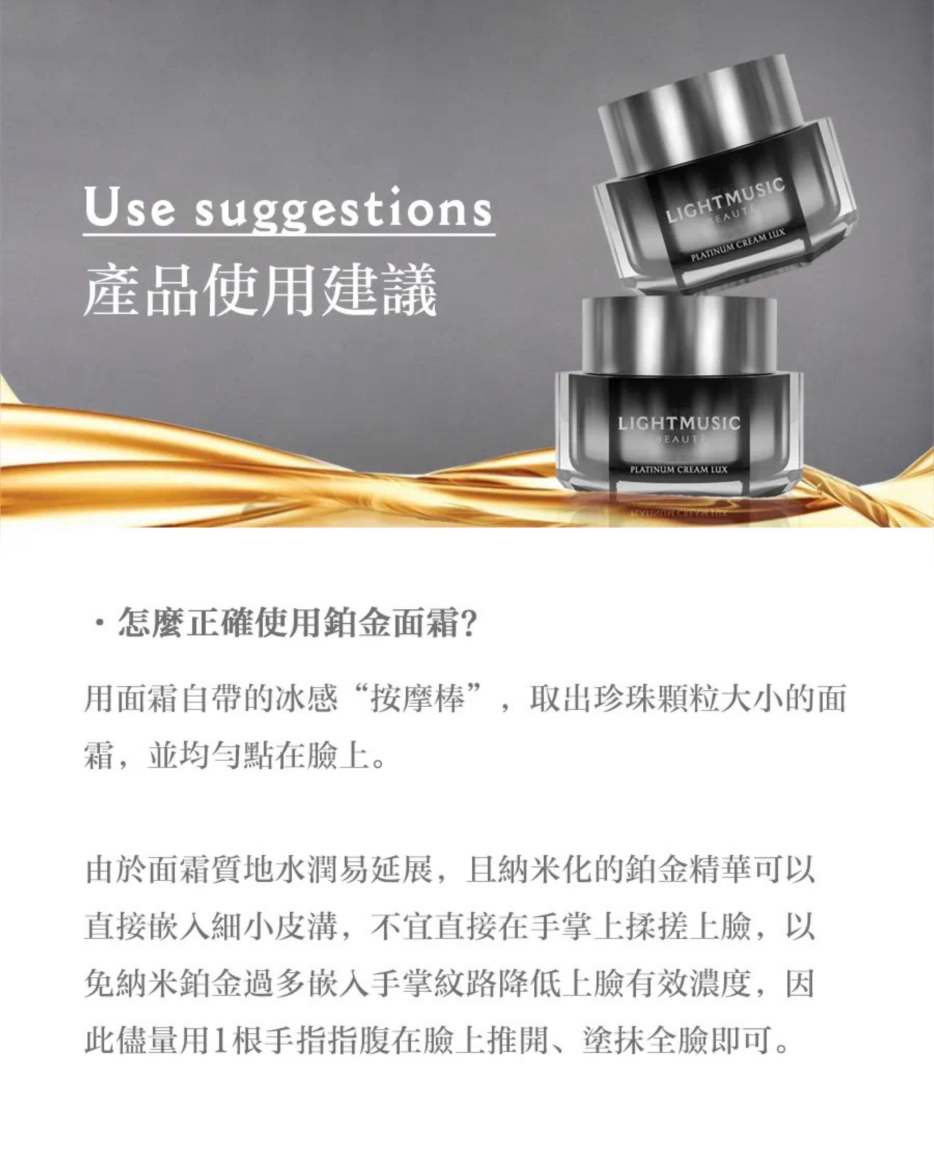 贵妇用法:先涂一层铂金霜,然后再继续叠涂其他的护肤品,最后再来一层铂金霜,效果更佳。